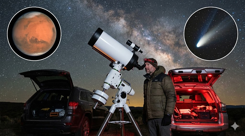 Телескоп с диаметром объектива 90мм уже достаточно мощный оптический прибор, но еще имеет достаточно небольшие размеры для переноски одним человеком. Эта модель покажет Вам несколько сотен деталей на Луне, десятки подробностей на Юпитере и его спутники, кольца и диск Сатурна, полярную шапку на диске Марса. Вы сможете уверенно рассмотреть фазы Меркурия и Венеры, различить цветные диски Урана и Нептуна, проследить за яркими кометами. Кроме того, этому телескопу доступны для наблюдений сотни рассеянных и шаровых звездных скоплений, десятки диффузных и планетарных туманностей, и даже некоторые галактики.